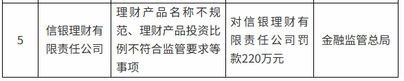 金融监管总局披露的行政处罚信息公开表显示,信银理财有限责任公司因理财产品名称不规范、理财产品投资比例不符合监管要求等事项,被金融监管总局罚款220万元。