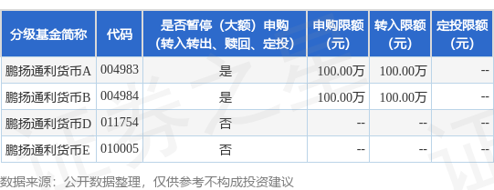 本站消息,5月6日鹏扬基金管理有限公司发布《关于调整鹏扬现金通利货币市场基金在部分代销渠道大额申购(含转换转入、定期定额投资)限制金额的公告》。公告中提示,为保护本基金的平稳运作,保护基金份额持有人利益,自2025年5月6日起调整鹏扬现金通利货币市场基金在部分代销渠道大额申购(含转换转入、定期定额投资)限制金额,申购、转换转入上限金额为100.0万元优配物料,下属分级基金调整明细如下: