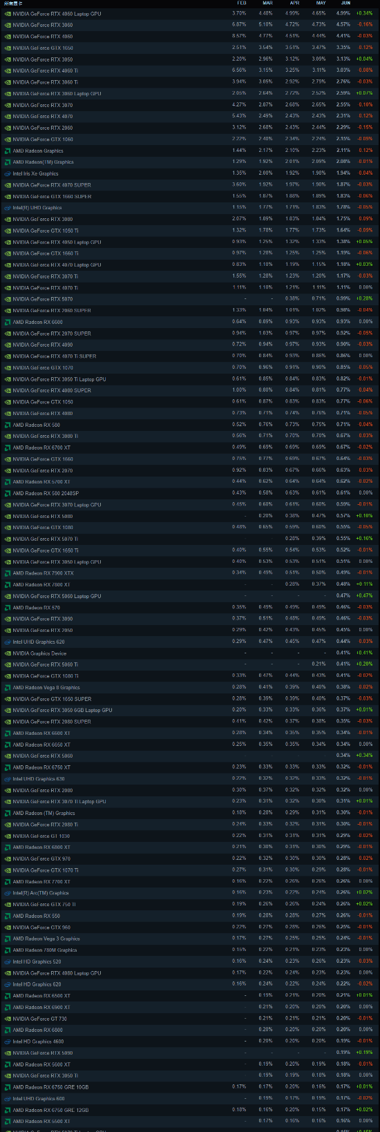 截至6月,使用率排名前五的显卡如下: