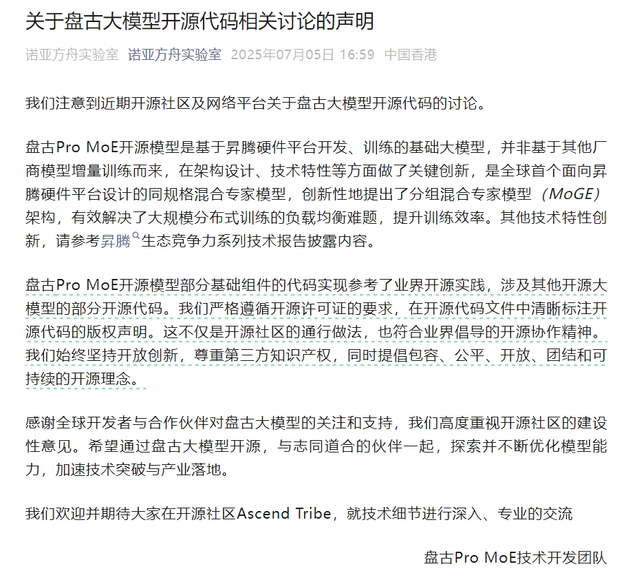 上述团队表示,“盘古Pro MoE开源模型部分基础组件的代码实现参考了业界开源实践,涉及其他开源大模型的部分开源代码。我们严格遵循开源许可证的要求,在开源代码文件中清晰标注开源代码的版权声明。这不仅是开源社区的通行做法,也符合业界倡导的开源协作精神。”