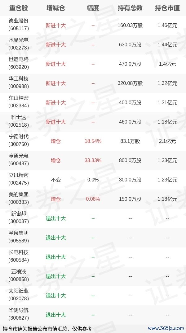 本站消息,4月22日长信基金旗下高远管理的长信金利趋势混合型基金公布一季报车优配,近1年净值增长率-7.01%。与上一季度相比,该基金前十大重仓股新增德业股份,水晶光电,世运电路,华工科技,东山精密,科士达;并对宁德时代增仓13.0万股,为该基金第一大重仓股;新宙邦,圣泉集团,长电科技,五粮液,太阳纸业,华测导航等退出前十大重仓股;详细数据如下: