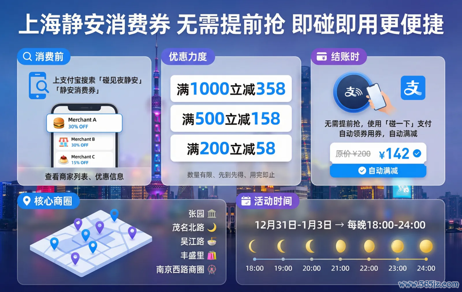 为力推2026消费开门红,在元旦小长假期间,上海静安区推出了全新的消费券模式:无需提前抢券,碰一下支付时自动领券用券实现满减。该“碰见夜静安”活动将自12月31日持续至2026年1月3日,每晚18:00至24:00在活动商家消费用碰一下支付即可自动参与。每日限量,先碰先得,碰完即止。