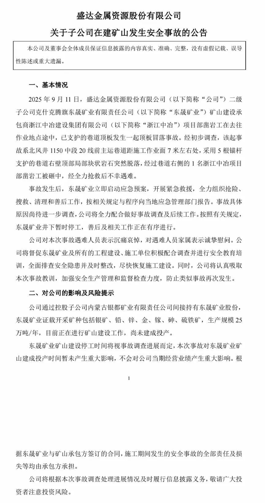 【导读】盛达资源二级子公司东晟矿业在建矿山发生安全事故,一名凿岩工遇难