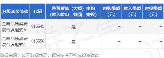 本站消息掌上世界,5月6日金鹰基金管理有限公司发布《金鹰基金管理有限公司关于金鹰品质消费混合型发起式证券投资基金暂停申购(含转换转入、定期定额投资)的公告》。公告中提示,为保护基金份额持有人的利益,自2025年5月6日起金鹰基金管理有限公司关于金鹰品质消费混合型发起式证券投资基金暂停申购(含转换转入、定期定额投资),下属分级基金调整明细如下: