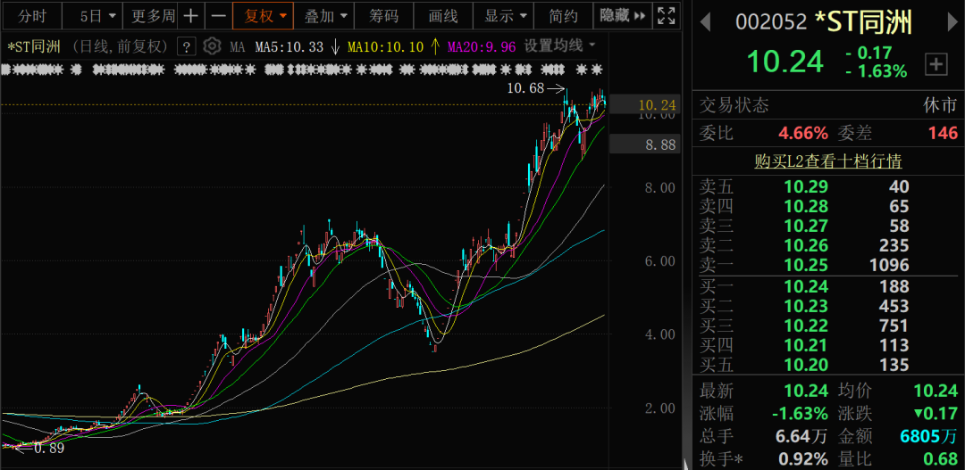 回溯原委,*ST同洲2023年年度经审计后的净利润(扣除非经常性损益前后孰低)为负值且营业收入低于1亿元,根据规定,公司股票于2024年4月23日开市起被实施退市风险警示。