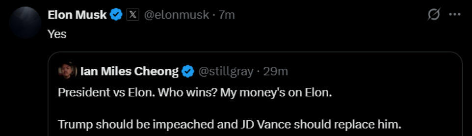 马斯克当天在社交媒体平台“X”上一则有关支持弹劾特朗普的贴文中回复“是的”星迈网。