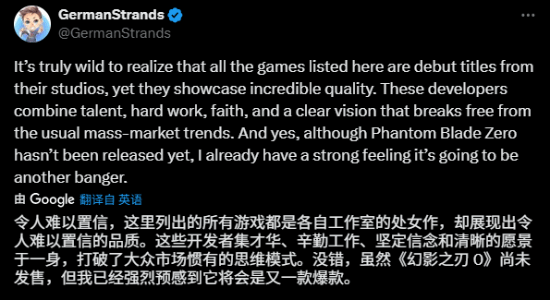 游戏博主GermanStrands今日发文,列举了四款品质惊人的处女作,分别是法国的《光与影:33号远征队》、韩国的《剑星》,和两款国产大作《黑神话:悟空》、《影之刃零》。