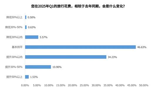 环球旅讯联合专业洞察机构数字 100 发布的《2025Q2 中国旅游消费趋势洞察报告》显示,超四成游客表示今年 Q1 旅行花费保持稳定,另有超过 34% 的游客预计旅行花费增长 30% 以内,还有约 11% 游客愿意增加 30% 以上预算用于旅行。